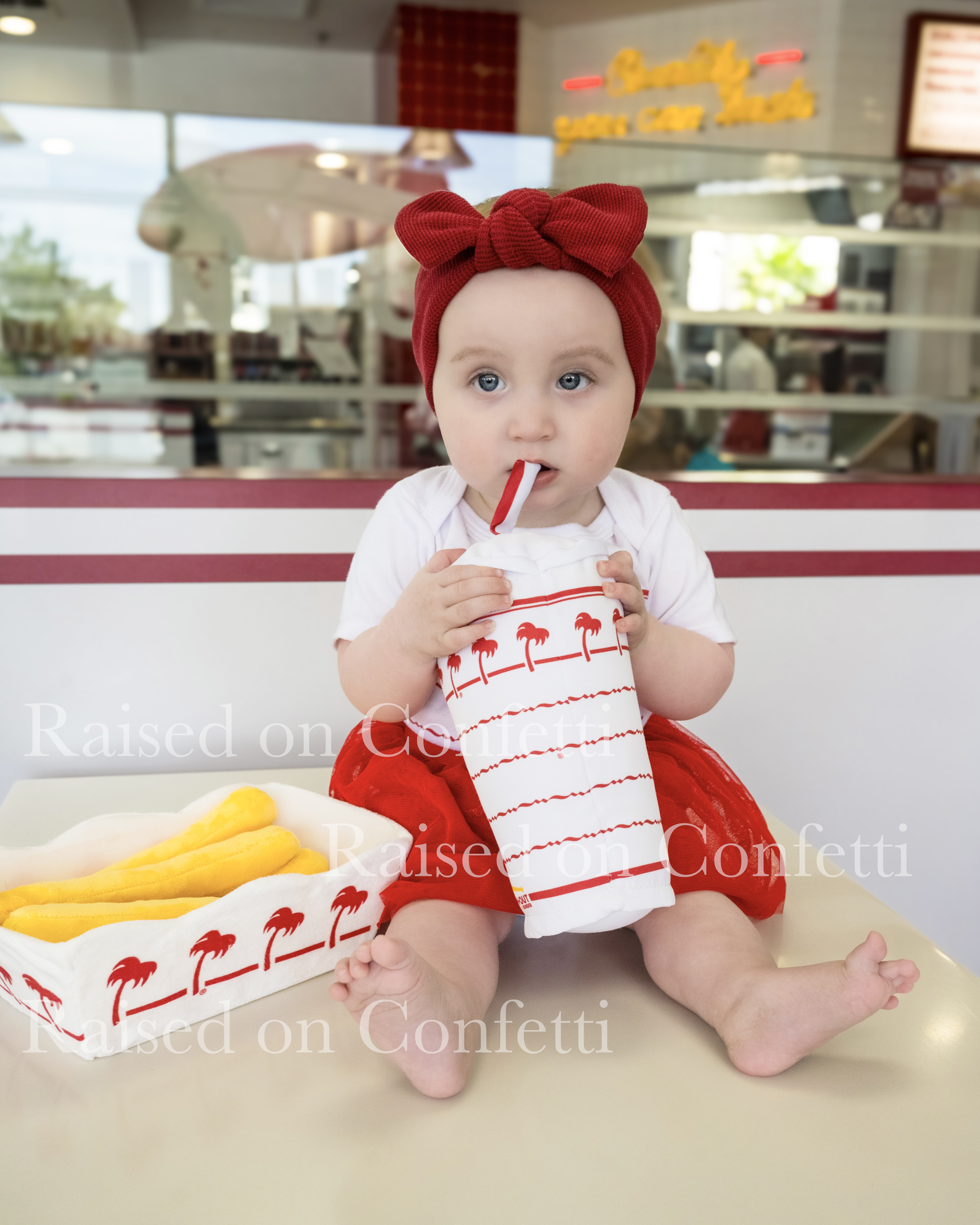 No fries for her just yet (don’t worry!), but she did gleefully play with her stuffed fries and drink like the burger baby she is.